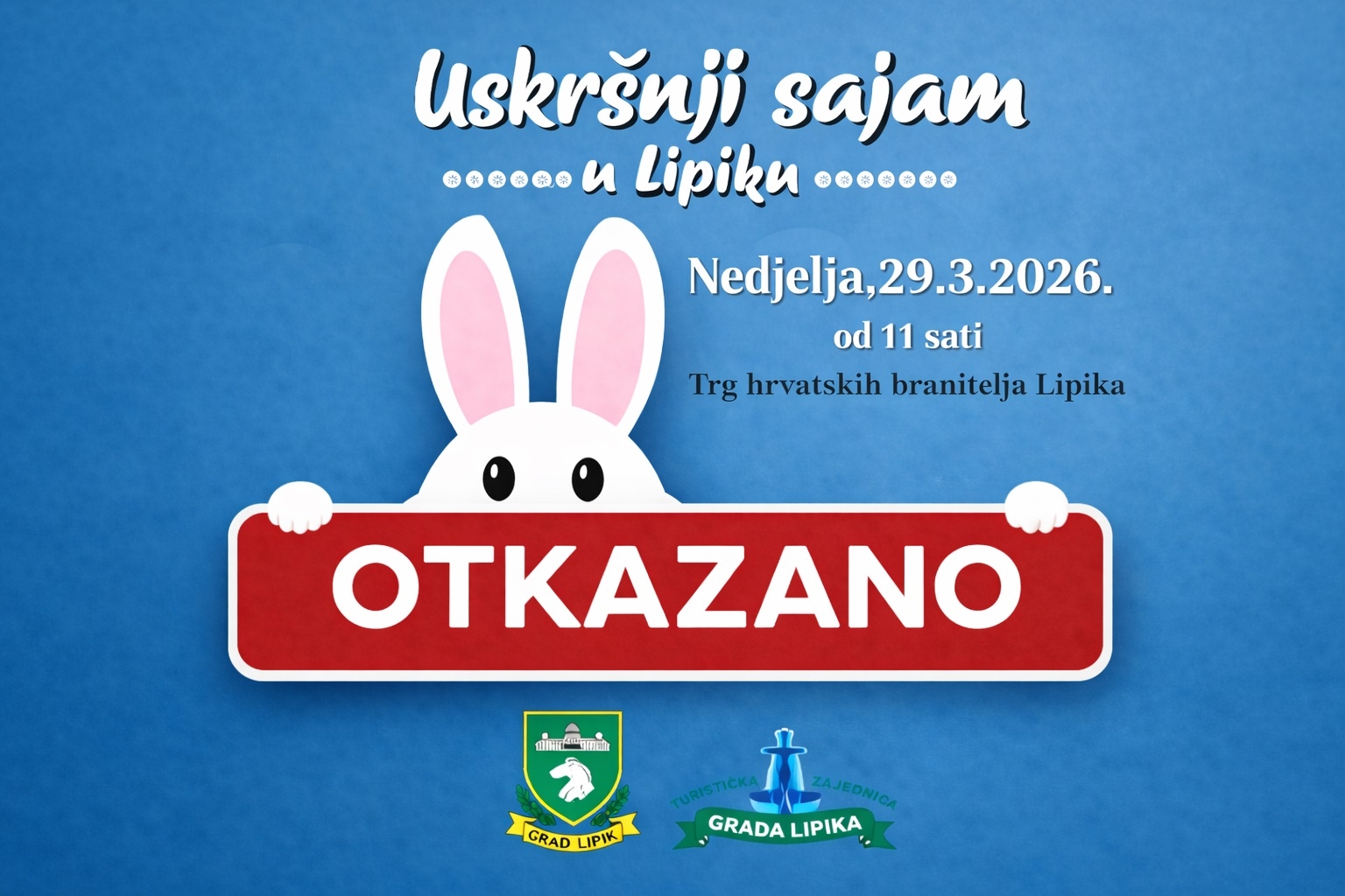 Uskršnji sajam, koji se trebao održati u nedjelju, 29. ožujka, u organizaciji Turističke zajednice Grada Lipika i Grada Lipika, otkazan je zbog nepovoljnih vremenskih prilika.