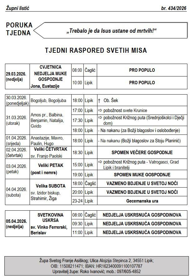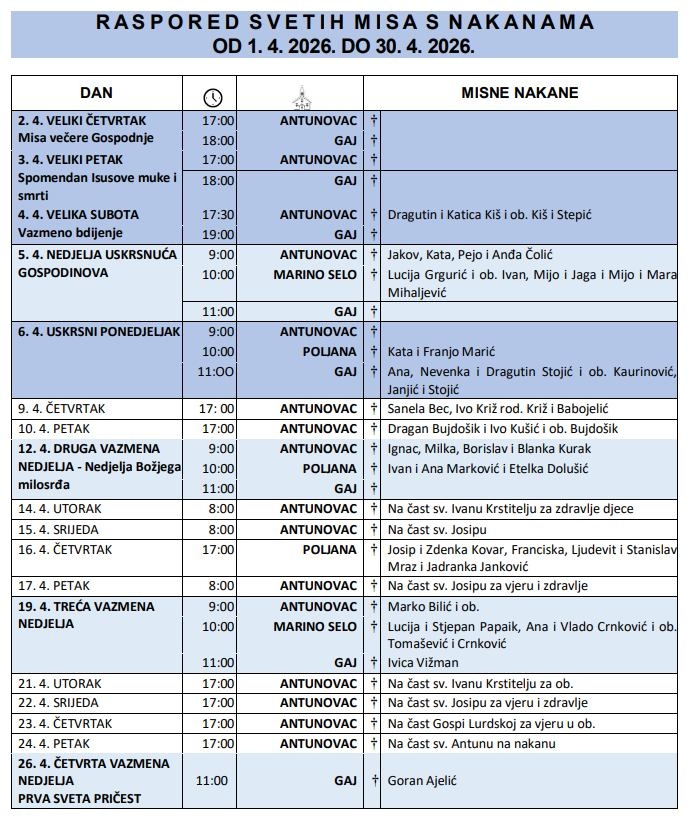 Uskrs, središnji i najradosniji kršćanski blagdan, slavi pobjedu života nad smrću. Uskrsne mise bit će služene u 8 sati u Čagliću, u 9 sati u Antunovcu, u 9:30 i 11 sati u Lipiku, u 10 sati u Poljani te u 11 sati u Gaju.
