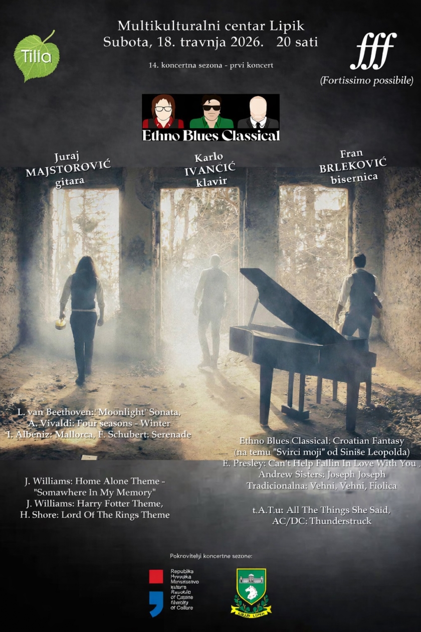 Koncertnu sezonu otvorit će u subotu, 18. travnja u 20 sati u Multikulturalnom centru Lipik trio Ethno Blues Classical, koji već na samom početku donosi drugačiji koncertni doživljaj.