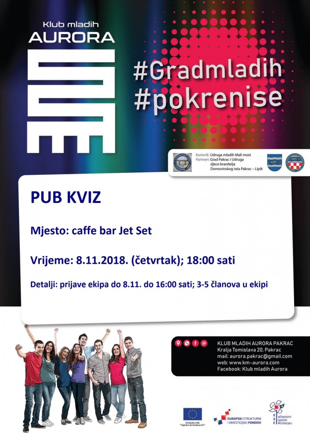 U organizaciji Kluba mladih Aurora u caffe baru Jet Set u Pakracu u četvrtak 8. studenog održat će se PUB KVIZ. Početak kviza je predviđen za 18:00 sati, dok će se zainteresirane ekipe moći prijaviti najkasnije dva sata prije samog početka, dakle do 16:00 sati. Prijave se vrše na e-mail: aurora.pakrac@gmail.com ili putem privatne poruke na njihovom Facebook profilu. Jedna ekipa može brojati 3 do 5 članova pa dobro promislite tko će biti s vama u timu!