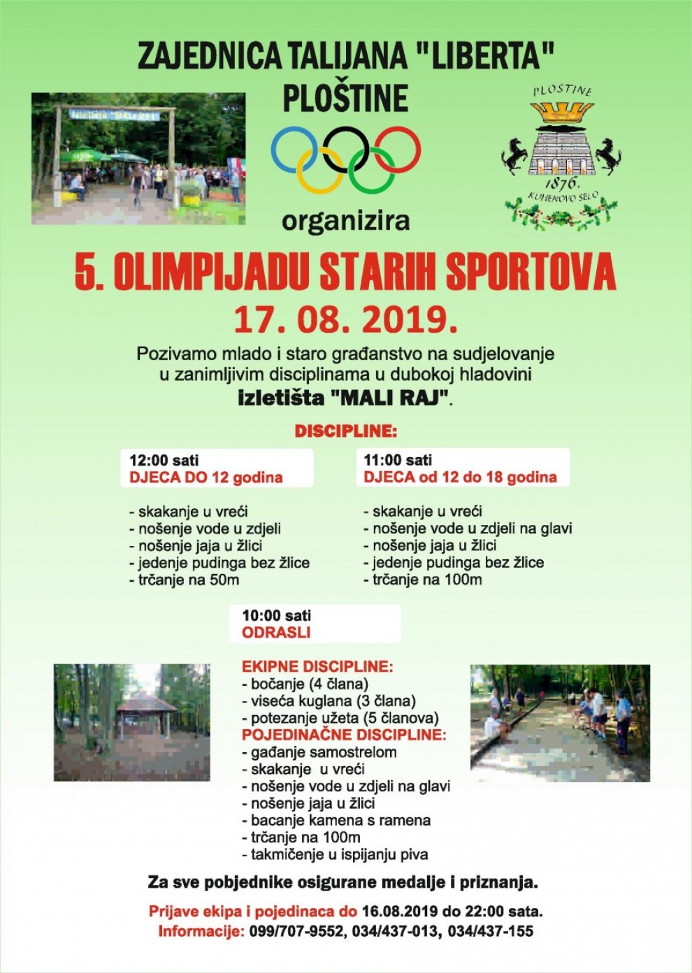 Zajednica Talijana "Liberta" iz Ploština nastavlja održavati tradiciju svog mjesta i kraja pa će tako u subotu, 17. kolovoza, održati petu po redu "Olimpijadu starih sportova" u izletištu "Mali raj" nedaleko od Ploština.