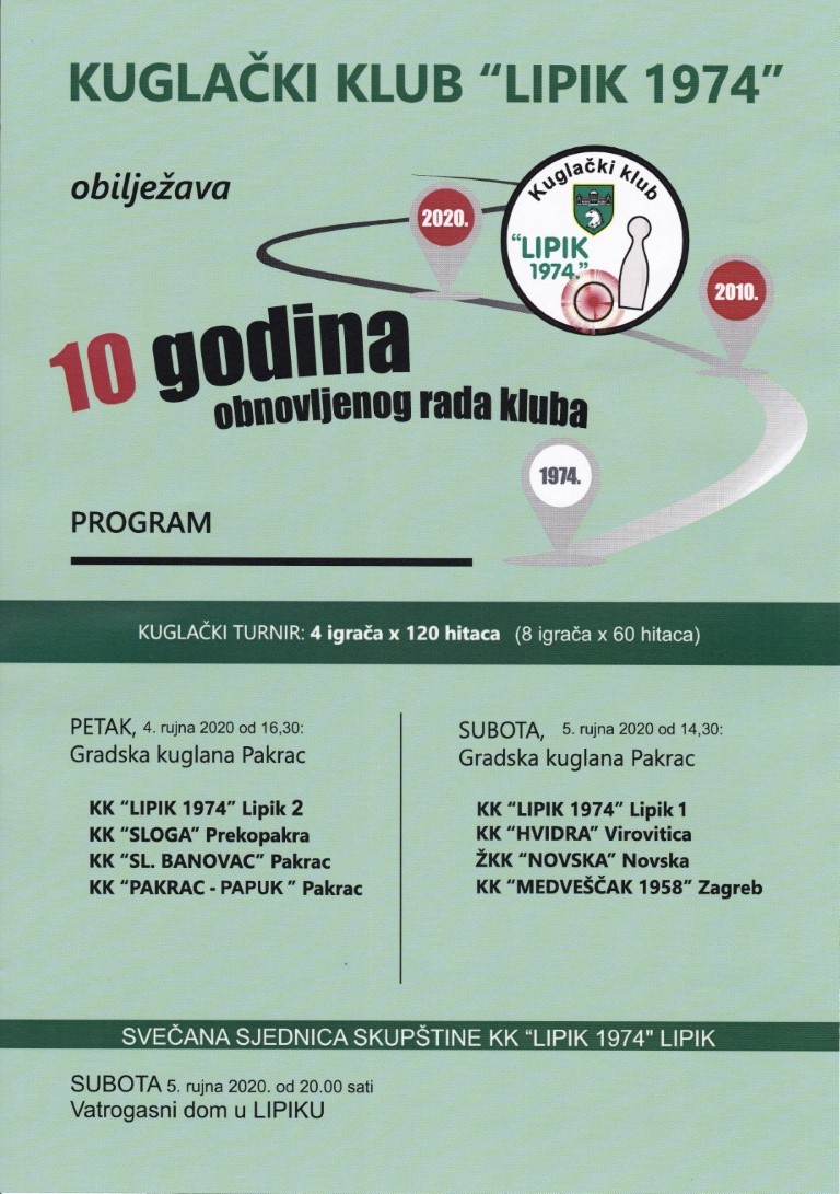 Izgradnjom gradske kuglane u Pakracu počela je rasti želja za ponovnim aktiviranjem kuglanja u Lipiku. Inicijativni odbor u sastavu: Ivica Kozić, Ivica Osmak, Predrag Nemet, Tomislav Luksetić i Mirko Tušim, pokrenuo je zajedno s predstavnicima Grada Lipika inicijativu da se osnuje (obnovi) rad kuglačkog kluba u Lipiku. U lipičkom Multikulturalnom centru 23. travnja 2010., osnovan je Kuglački klub „Lipik 1974“. Ime je odabrano tako da na neki način objedini i nastavi tradiciju prijeratnih lipičkih klubova „Lipik“ i „Staklana“. Godina 1974. je izabrana iz razloga što iz nje imamo pisani najstariji trag o učešću kluba u natjecanju. Za prvog predsjednika kluba je izabran Mirko Tušim.