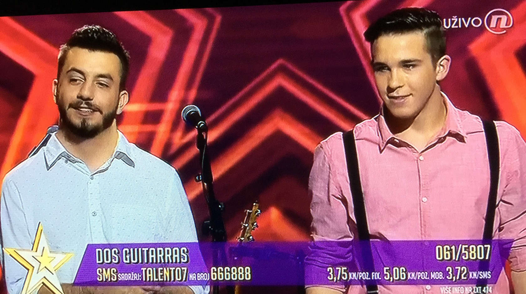 Malo je nedostajalo da poznati pakrački dvojac Dos Guitarras, Toni Mandušić i Grgur Špančić uđe u finale u prvoj polufinalnoj emisiji poznatog showa SUPERTALENT. Emisija je išla uživo 1. svibnja na programu NOVE TV, a publika i gledatelji su glasovima Tonija i Grgura postavili na visoko treće mjesto, no ipak odluka žirija, koji nije bio naklonjen nihovoj izvedbi, u ovom slučaju je presudila i izbacila dvojac iz daljnjeg natjecanja.