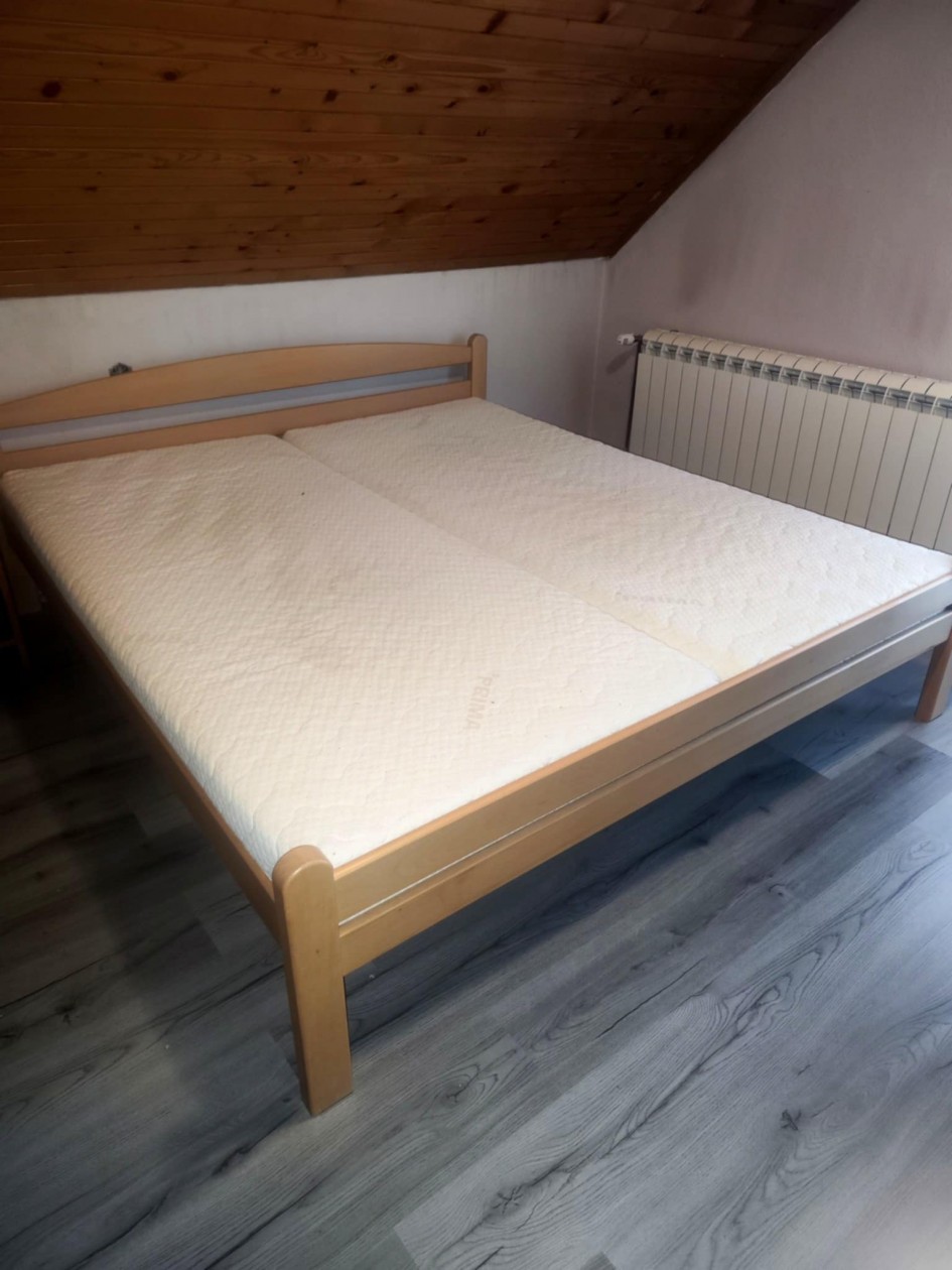 Prodajem: - Bračni krevet 160x200 cm, bijeli, model Paola Prima namještaj, podnica, madrac, nadmadrac, zaštita za madrac, sve vrlo očuvano. -Kupaonski ormarić podni, bijeli š32dub35v83 cm, gore ladica (žuta), ispod ugrađena košara za rublje.